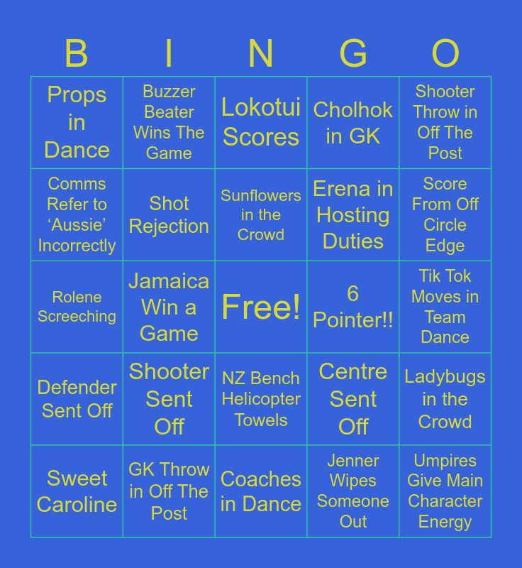 This bingo card has a free space and 24 words: Sweet Caroline, Shooter Sent Off, Sunflowers in the Crowd, Jenner Wipes Someone Out, Shooter Throw in Off The Post, Props in Dance, Buzzer Beater Wins The Game, Lokotui Scores, 6 Pointer!!, Tik Tok Moves in Team Dance, Rolene Screeching, Shot Rejection, Centre Sent Off, Ladybugs in the Crowd, Comms Refer to ‘Aussie’ Incorrectly, GK Throw in Off The Post, Coaches in Dance, Cholhok in GK, Score From Off Circle Edge, Defender Sent Off, Jamaica Win a Game, NZ Bench Helicopter Towels, Erena in Hosting Duties and Umpires Give Main Character Energy.