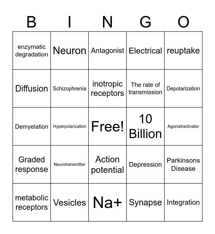 This bingo card has a free space and 24 words: Neurotransmitter, Vesicles, inotropic receptors, metabolic receptors, reuptake, enzymatic degradation, Diffusion, Neuron, 10 Billion, Action potential, The rate of transmission, Demyelation, Depression, Parkinsons Disease, Schizophrenia, Synapse, Agonist/activator, Antagonist, Depolarization, Hyperpolarization, Integration, Graded response, Electrical and Na+.