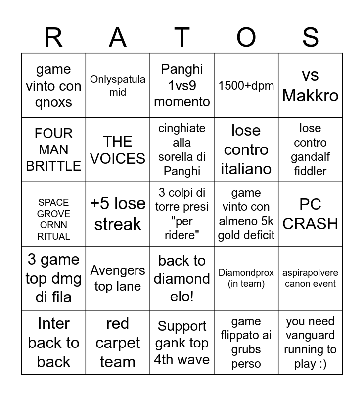 This bingo card has a free space and 24 words: Avengers top lane, red carpet team, cinghiate alla sorella di Panghi, Inter back to back, vs Makkro, game vinto con qnoxs, FOUR MAN BRITTLE, Onlyspatula mid, game vinto con almeno 5k gold deficit, back to diamond elo!, lose contro italiano, SPACE GROVE ORNN RITUAL, Diamondprox (in team), aspirapolvere canon event, THE VOICES, game flippato ai grubs perso, PC CRASH, Panghi 1vs9 momento, lose contro gandalf fiddler, +5 lose streak, you need vanguard running to play :), 3 game top dmg di fila, 1500+dpm and Support gank top 4th wave.