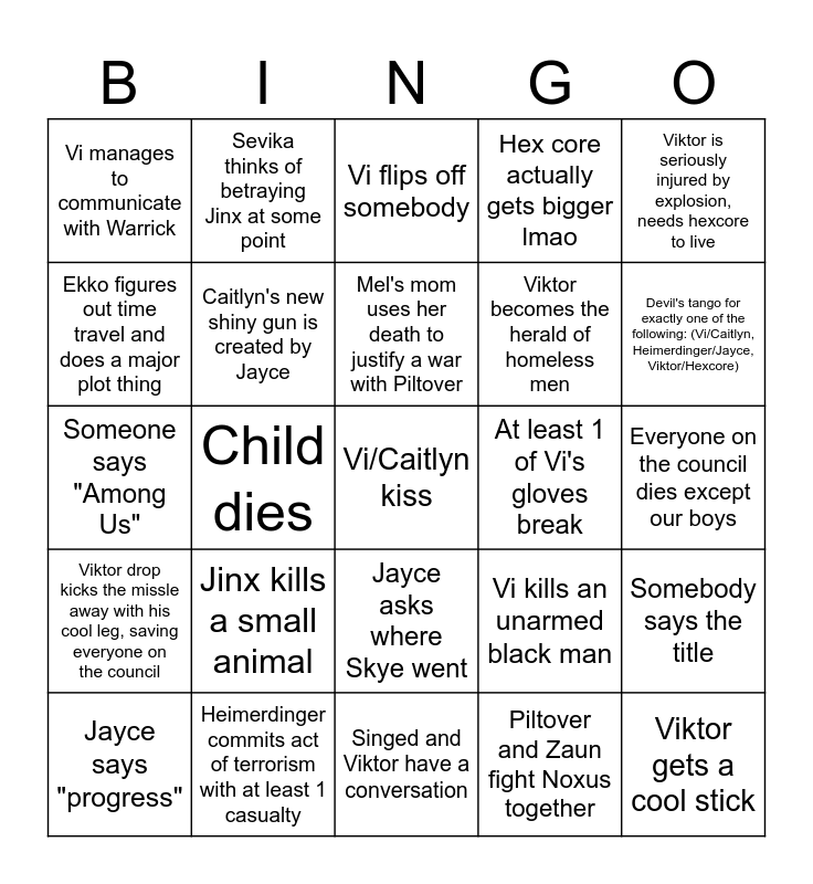 This bingo card has a free space and 24 words: Jinx kills a small animal, Heimerdinger commits act of terrorism with at least 1 casualty, Mel's mom uses her death to justify a war with Piltover, Jayce says "progress", Viktor is seriously injured by explosion, needs hexcore to live, Vi manages to communicate with Warrick, Ekko figures out time travel and does a major plot thing, Sevika thinks of betraying Jinx at some point, At least 1 of Vi's gloves break, Jayce asks where Skye went, Viktor becomes the herald of homeless men, Someone says "Among Us", Vi kills an unarmed black man, Somebody says the title, Caitlyn's new shiny gun is created by Jayce, Piltover and Zaun fight Noxus together, Everyone on the council dies except our boys, Vi flips off somebody, Devil's tango for exactly one of the following: (Vi/Caitlyn, Heimerdinger/Jayce, Viktor/Hexcore), Child dies, Viktor gets a cool stick, Viktor drop kicks the missle away with his cool leg, saving everyone on the council, Hex core actually gets bigger lmao and Singed and Viktor have a conversation.