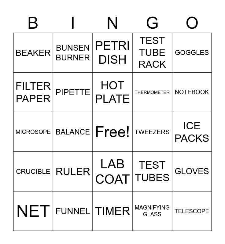 This bingo card has a free space and 24 words: RULER, FUNNEL, HOT PLATE, NET, GOGGLES, BEAKER, FILTER PAPER, BUNSEN BURNER, TWEEZERS, LAB COAT, THERMOMETER, MICROSOPE, TEST TUBES, GLOVES, PIPETTE, MAGNIFYING GLASS, ICE PACKS, PETRI DISH, NOTEBOOK, BALANCE, TELESCOPE, CRUCIBLE, TEST TUBE RACK and TIMER.