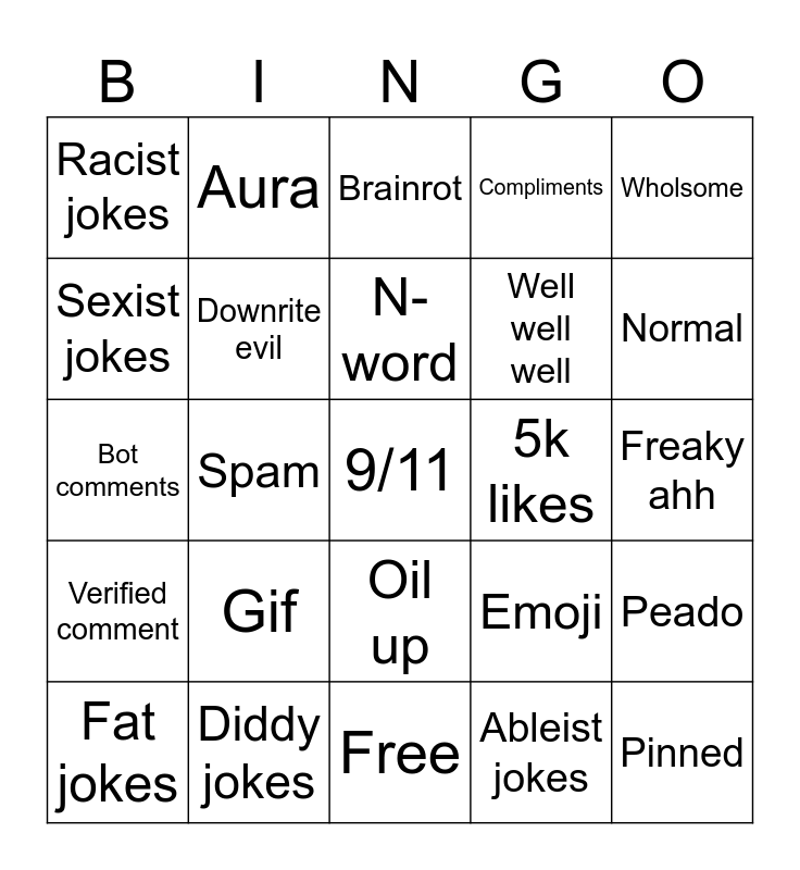 This bingo card has a free space and 24 words: Gif, Diddy jokes, N- word, Fat jokes, Wholsome, Racist jokes, Sexist jokes, Aura, 5k likes, Oil up, Well well well, Bot comments, Emoji, Peado, Downrite evil, Ableist jokes, Freaky ahh, Brainrot, Normal, Spam, Pinned, Verified comment, Compliments and Free.
