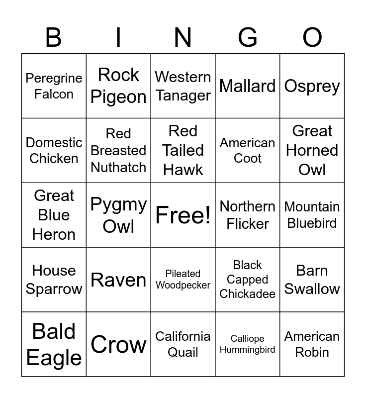 This bingo card has a free space and 24 words: Raven, Crow, Red Tailed Hawk, Bald Eagle, Osprey, Peregrine Falcon, Domestic Chicken, Rock Pigeon, Northern Flicker, Pileated Woodpecker, American Coot, Great Blue Heron, Black Capped Chickadee, Barn Swallow, Red Breasted Nuthatch, Calliope Hummingbird, Mountain Bluebird, Western Tanager, Great Horned Owl, Pygmy Owl, American Robin, House Sparrow, Mallard and California Quail.