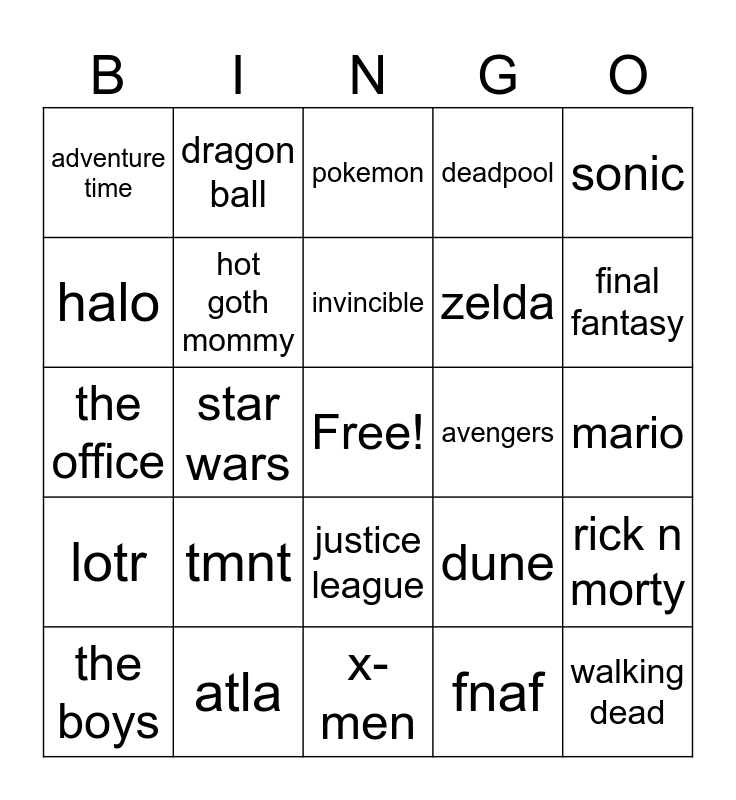This bingo card has a free space and 24 words: tmnt, atla, invincible, the boys, sonic, adventure time, halo, dragon ball, avengers, justice league, zelda, the office, dune, rick n morty, hot goth mommy, fnaf, mario, pokemon, final fantasy, star wars, walking dead, lotr, deadpool and x-men.