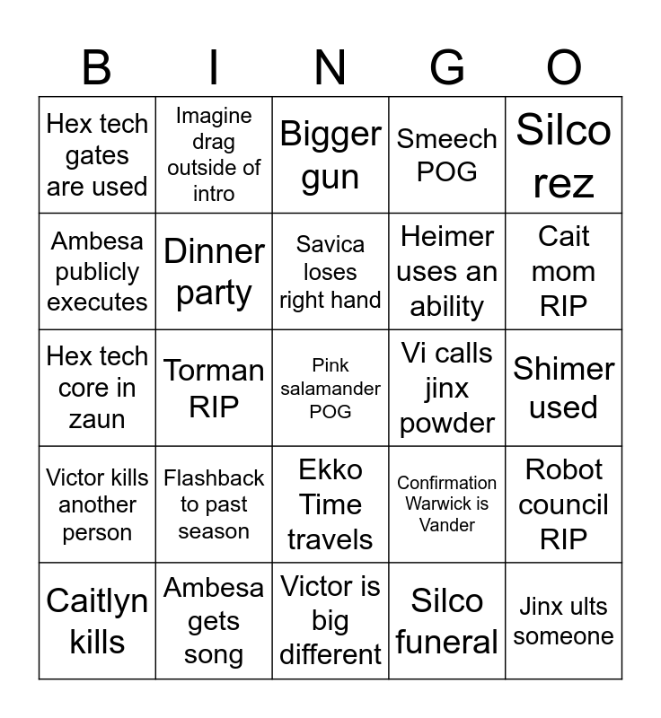 This bingo card has 25 words: Flashback to past season, Victor is big different, Savica loses right hand, Caitlyn kills, Silco rez, Hex tech gates are used, Ambesa publicly executes, Imagine drag outside of intro, Vi calls jinx powder, Ekko Time travels, Heimer uses an ability, Hex tech core in zaun, Confirmation Warwick is Vander, Robot council RIP, Dinner party, Jinx ults someone, Shimer used, Bigger gun, Cait mom RIP, Torman RIP, Pink salamander POG, Ambesa gets song, Victor kills another person, Smeech POG and Silco funeral.