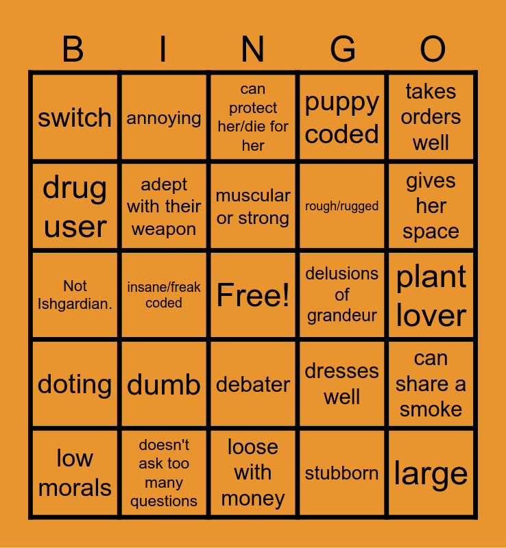 This bingo card has a free space and 24 words: dumb, doesn't ask too many questions, muscular or strong, low morals, takes orders well, switch, drug user, annoying, delusions of grandeur, debater, rough/rugged, Not Ishgardian., dresses well, can share a smoke, adept with their weapon, stubborn, plant lover, can protect her/die for her, gives her space, insane/freak coded, large, doting, puppy coded and loose with money.
