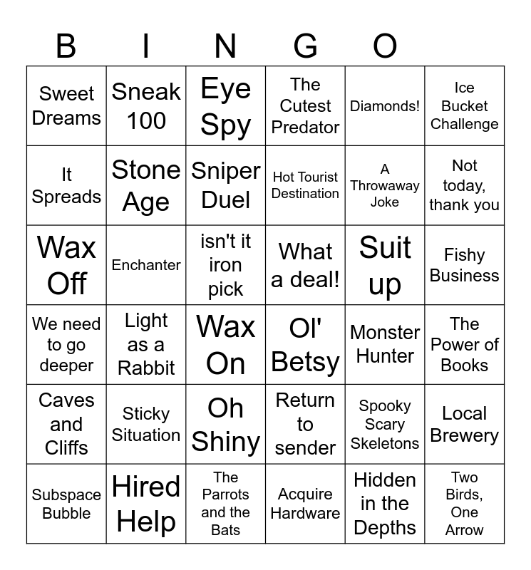 This bingo card has 36 words: Return to sender, Oh Shiny, Acquire Hardware, It Spreads, We need to go deeper, What a deal!, Stone Age, The Parrots and the Bats, Diamonds!, Spooky Scary Skeletons, Not today, thank you, The Cutest Predator, Local Brewery, Enchanter, Hot Tourist Destination, Sweet Dreams, Caves and Cliffs, Suit up, Wax Off, Eye Spy, isn't it iron pick, Light as a Rabbit, Ol' Betsy, Wax On, Monster Hunter, Sneak 100, A Throwaway Joke, Hired Help, Sniper Duel, Ice Bucket Challenge, Two Birds, One Arrow, Subspace Bubble, The Power of Books, Fishy Business, Sticky Situation and Hidden in the Depths.