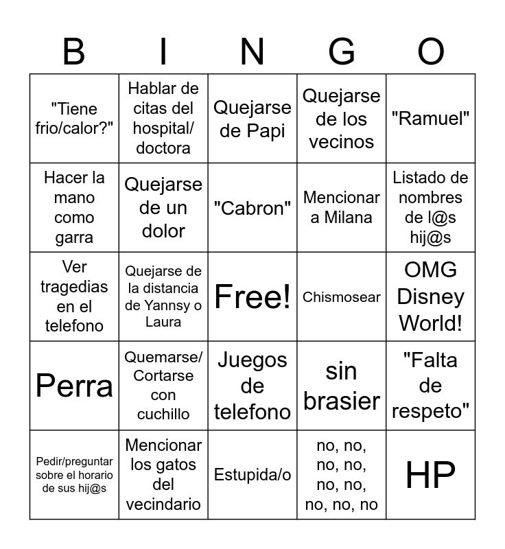 This bingo card has a free space and 29 words: Pedir/preguntar sobre el horario de sus hij@s, Llorar, Quejarse de la distancia de Yannsy o Laura, Mencionar un dolor, "Tiene frio/calor?", Quejarse de Papi, Quejarse de un dolor, Quemarse/ Cortarse con cuchillo, Chismosear, Mencionar los gatos del vecindario, OMG Disney World!, HP, Estupida/o, no, no, no, no, no, no, no, no, no, Listado de nombres de l@s hij@s, Uso del telefono con volumen alto, Juegos de telefono, Perra, "Ramuel", Ver tragedias en el telefono, sin brasier, Mencionar a Precious, Mencionar a Milana, Hacer la mano como garra, Quejarse de los vecinos, Hablar de citas del hospital/ doctora, "Falta de respeto", "Cabron" and *gemidos*.