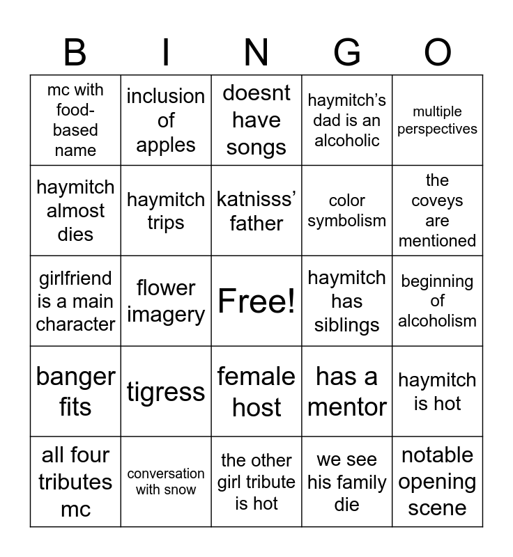 This bingo card has a free space and 24 words: tigress, conversation with snow, katnisss’ father, all four tributes mc, multiple perspectives, mc with food-based name, haymitch almost dies, inclusion of apples, haymitch has siblings, female host, color symbolism, girlfriend is a main character, has a mentor, haymitch is hot, haymitch trips, we see his family die, beginning of alcoholism, doesnt have songs, the coveys are mentioned, flower imagery, notable opening scene, banger fits, haymitch’s dad is an alcoholic and the other girl tribute is hot.