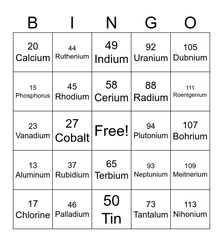 This bingo card has a free space and 24 words: 17 Chlorine, 37 Rubidium, 58 Cerium, 73 Tantalum, 105 Dubnium, 20 Calcium, 44 Ruthenium, 49 Indium, 94 Plutonium, 107 Bohrium, 23 Vanadium, 45 Rhodium, 93 Neptunium, 109 Meitnerium, 15 Phosphorus, 46 Palladium, 50 Tin, 92 Uranium, 111 Roentgenium, 13 Aluminum, 27 Cobalt, 65 Terbium, 88 Radium and 113 Nihonium.