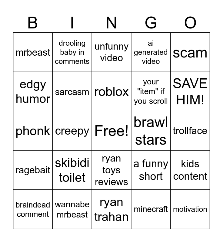 This bingo card has a free space and 24 words: braindead comment, skibidi toilet, roblox, minecraft, scam, mrbeast, drooling baby in comments, unfunny video, brawl stars, trollface, phonk, sarcasm, a funny short, kids content, edgy humor, wannabe mrbeast, ryan trahan, ai generated video, SAVE HIM!, ragebait, creepy, ryan toys reviews, your "item" if you scroll and motivation.