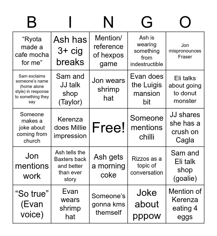 This bingo card has a free space and 24 words: Ash tells the Baxters back and better than ever story, Evan wears shrimp hat, Jon wears shrimp hat, “So true” (Evan voice), Jon mispronounces Fraser, “Ryota made a cafe mocha for me”, Sam exclaims someone’s name (home alone style) in response to something they say, Ash has 3+ cig breaks, Someone mentions chilli, Ash gets a morning coke, Evan does the Luigis mansion bit, Someone makes a joke about coming from church, Rizzos as a topic of conversation, Sam and Eli talk shop (goalie), Sam and JJ talk shop (Taylor), Joke about pppow, JJ shares she has a crush on Cagla, Mention/ reference of hexpos game, Eli talks about going to donut monster, Kerenza does Millie impression, Mention of Kerenza eating 4 eggs, Jon mentions work, Ash is wearing something from indestructible and Someone’s gonna kms themself.