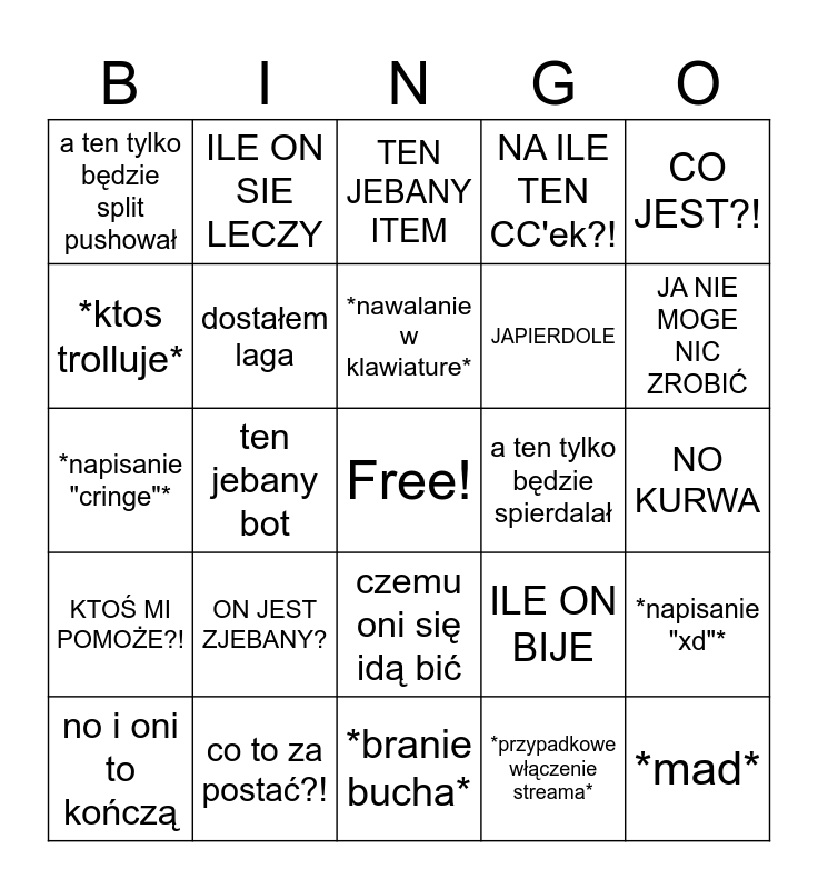 This bingo card has a free space and 28 words: co za cwel, co to za postać?!, *nawalanie w klawiature*, *przypadkowe włączenie streama*, CO JEST?!, a ten tylko będzie split pushował, dostałem laga, *branie bucha*, a ten tylko będzie spierdalał, *napisanie "xd"*, *napisanie "cringe"*, ten jebany bot, ILE ON BIJE, *mad*, *ktos trolluje*, a ta znowu sie wypierdala, czemu oni się idą bić, NA ILE TEN CC'ek?!, JA NIE MOGE NIC ZROBIĆ, no i oni to kończą, ILE ON SIE LECZY, ALE ON/ONI/ONA JEST USELESS, JAPIERDOLE, NO KURWA, KTOŚ MI POMOŻE?!, ON JEST ZJEBANY?, TEN JEBANY ITEM and BUDUJE ANTY HEALA.