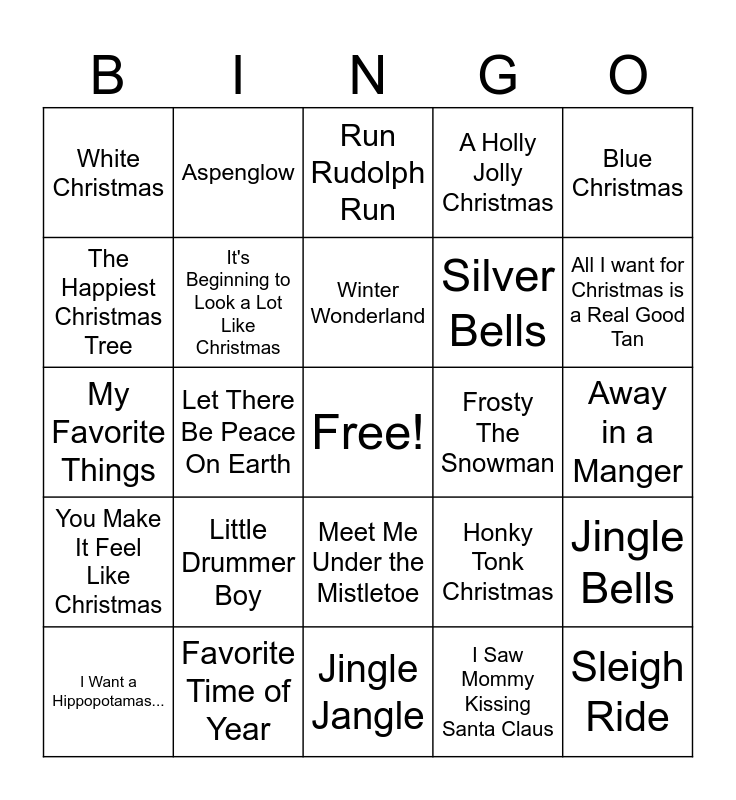 This bingo card has a free space and 32 words: I Saw Mommy Kissing Santa Claus, Deck The Halls, Let There Be Peace On Earth, Christmas in Dixie, You Make It Feel Like Christmas, It's Beginning to Look a Lot Like Christmas, Blue Christmas, Jingle Bells, Aspenglow, Up On The Housetop, Winter Wonderland, Run Rudolph Run, Rockin' Around The Christmas Tree, Please Come Home for Christmas, Frosty The Snowman, Where Are You Christmas, I Want a Hippopotamas..., My Favorite Things, Meet Me Under the Mistletoe, Little Drummer Boy, Honky Tonk Christmas, Mele KaliKimaka, Away in a Manger, Favorite Time of Year, Sleigh Ride, A Holly Jolly Christmas, Silver Bells, The Happiest Christmas Tree, White Christmas, Jingle Jangle, Carol of the Bells and All I want for Christmas is a Real Good Tan.