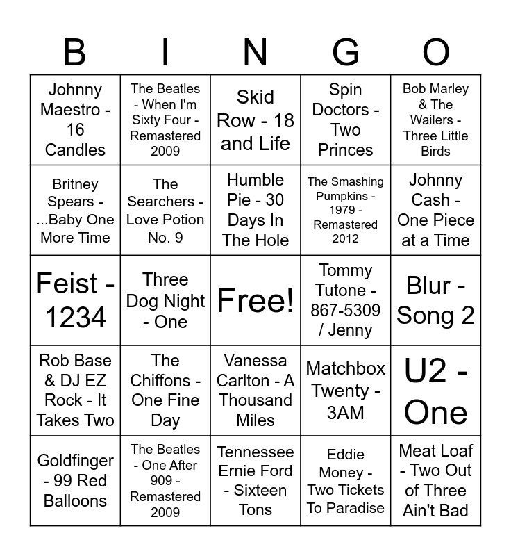 This bingo card has a free space and 55 words: The Beatles - Eight Days A Week - Remastered 2009, Goldfinger - 99 Red Balloons, The White Stripes - Seven Nation Army, Johnny Maestro - 16 Candles, Tennessee Ernie Ford - Sixteen Tons, Grover Washington, Jr. - Just the Two of Us (feat. Bill Withers) - Edit, The Searchers - Love Potion No. 9, Stevie Nicks - Edge of Seventeen, The Smashing Pumpkins - 1979 - Remastered 2012, Rush - 2112: Overture / The Temples Of Syrinx / Discovery / Presentation / Oracle / Soliloquy / Grand Finale - Medley, Spin Doctors - Two Princes, Lou Bega - Mambo No. 5 (a Little Bit of...), Commodores - Three Times A Lady, Queen - Another One Bites The Dust, Blondie - One Way Or Another, Adam Ant - Goody Two Shoes, Bob Marley & The Wailers - Three Little Birds, Three Dog Night - One, Sneaker Pimps - 6 Underground, Meat Loaf - Two Out of Three Ain't Bad, Tommy Tutone - 867-5309 / Jenny, Led Zeppelin - Ten Years Gone - Remaster, Matchbox Twenty - 3AM, Skid Row - 18 and Life, Sammy Hagar - I Can't Drive 55, Humble Pie - 30 Days In The Hole, Eddie Money - Two Tickets To Paradise, Bob Dylan - Highway 61 Revisited, Blur - Song 2, U2 - One, Madonna - 4 Minutes (feat. Justin Timberlake & Timbaland), Avril Lavigne - Sk8er Boi, Sinéad O'Connor - Nothing Compares 2 U, The Proclaimers - I'm Gonna Be (500 Miles), Britney Spears - ...Baby One More Time, Feist - 1234, Bowling For Soup - 1985, Rob Base & DJ EZ Rock - It Takes Two, Taylor Swift - 22 (Taylor's Version), Shania Twain - You're Still The One, The Beatles - When I'm Sixty Four - Remastered 2009, Dolly Parton - 9 to 5, Prince - 1999 - 2019 Remaster, Chicago - 25 or 6 to 4 - 2002 Remaster, The Chiffons - One Fine Day, The Beatles - One After 909 - Remastered 2009, R.E.M. - The One I Love, Phil Collins - One More Night - 2016 Remaster, Lynyrd Skynyrd - Gimme Three Steps, Johnny Cash - One Piece at a Time, Barenaked Ladies - One Week, Ciara - 1, 2 Step (feat. Missy Elliott), Bruno Mars - 24K Magic, Vanessa Carlton - A Thousand Miles and Smokey Robinson & The Miracles - I Second That Emotion.
