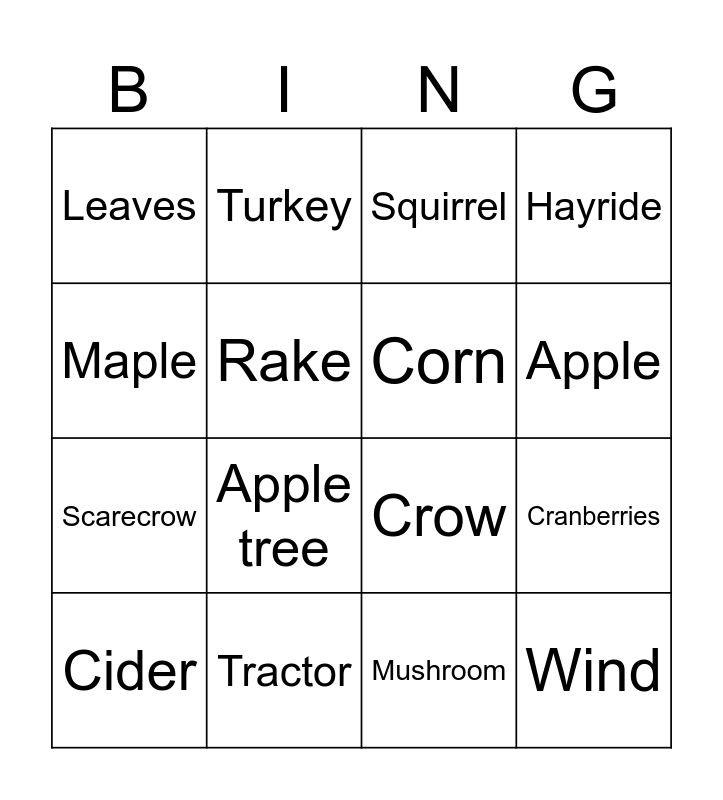 This bingo card has 24 words: Pumpkin, Pumpkin pie, Apple, Apple pie, Maple, Leaves, Rake, Turkey, Tractor, Owl, Scarecrow, Crow, Harvest, Acorn, Corn, Corn maze, Mushroom, Squirrel, Apple tree, Cranberries, Cider, Wind, Hayride and Autumn.