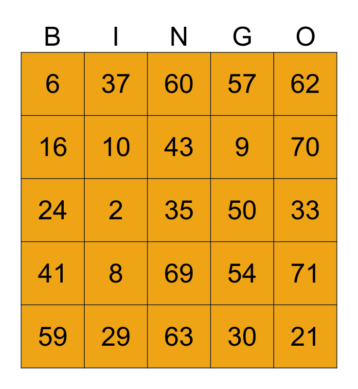 This bingo card has a free space and 24 words: 8, 29, 43, 59, 62, 6, 16, 37, 50, 69, 9, 24, 54, 71, 10, 30, 33, 60, 70, 2, 21, 41, 57 and 63.