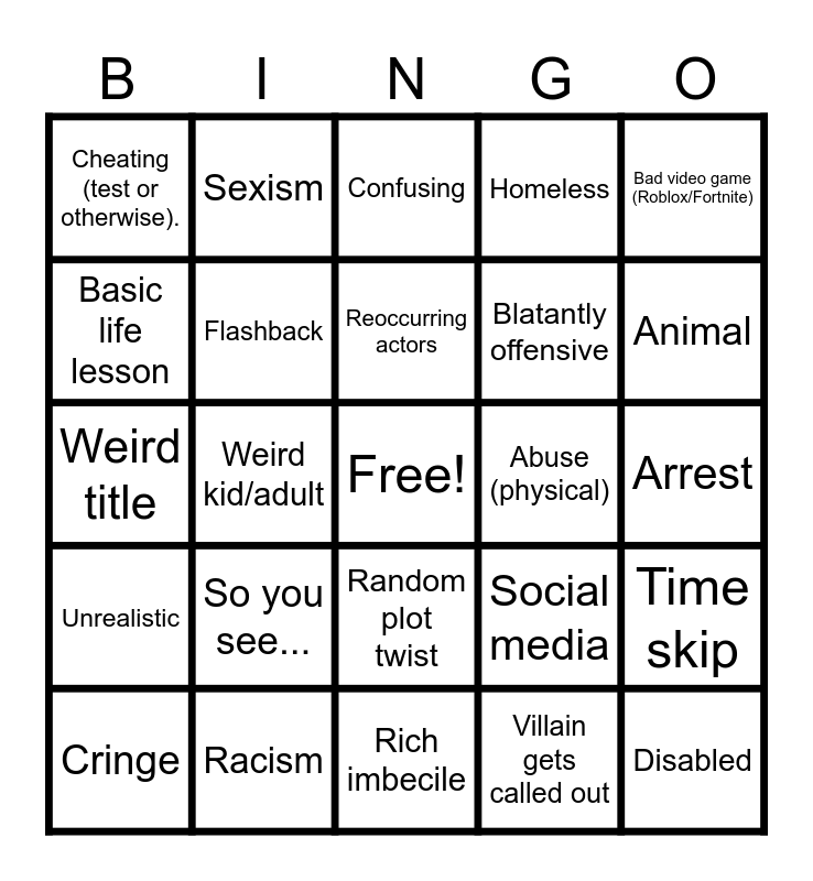 This bingo card has a free space and 24 words: So you see..., Racism, Reoccurring actors, Cringe, Bad video game (Roblox/Fortnite), Cheating (test or otherwise)., Basic life lesson, Sexism, Abuse (physical), Random plot twist, Blatantly offensive, Weird title, Social media, Time skip, Flashback, Villain gets called out, Arrest, Confusing, Animal, Weird kid/adult, Disabled, Unrealistic, Homeless and Rich imbecile.
