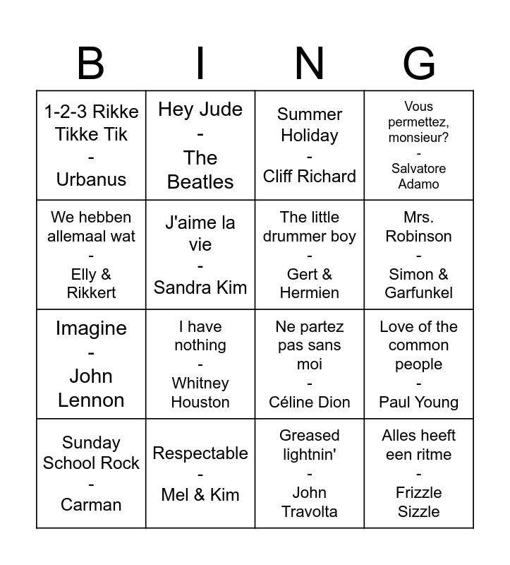 This bingo card has 20 words: Love of the common people - Paul Young, Opa - K3, Summer Holiday - Cliff Richard, Shine Jesus Shine - Graham Kendrick, Sunday School Rock - Carman, We hebben allemaal wat - Elly & Rikkert, Respectable - Mel & Kim, 1-2-3 Rikke Tikke Tik - Urbanus, Imagine - John Lennon, Hey Jude - The Beatles, I have nothing - Whitney Houston, Ne partez pas sans moi - Céline Dion, J'aime la vie - Sandra Kim, Alles heeft een ritme - Frizzle Sizzle, The little drummer boy - Gert & Hermien, Ding Dong Song - Günther, Mrs. Robinson - Simon & Garfunkel, Vous permettez, monsieur? - Salvatore Adamo, Greased lightnin' - John Travolta and California Dreamin' - The Mamas & The Papas.