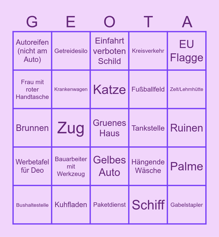 This bingo card has 86 words: Free!, Waschmaschine, Gelbes Auto, Rennende Frau, Stadtbus, Kaktus, Tunnel, Graffiti (nicht Schmiererei), Google Auto (Spiegelung), Bahnübergang, Kuh, Traktor, Palme, Ruinen, Denkmal/Statue, Katze, Burgerladen, Bauer mit Werkzeug, Friedhof, Wildes Tier (Kein Vogel), Ozean, Geldautomat, Brunnen, 5+ Fahrradfahrer, Schiff, Brücke, Hund, Briefkasten, Hydrant, Tempel/Kirche, Kuhfladen, Kran, Baufahrzeug, Bauarbeiter mit Werkzeug, Frau mit roter Handtasche, Dönerladen, Zelt/Lehmhütte, Polizeiauto, Feuerwehrauto, Zug, Garage, MC Donalds, Schnee (nicht Berg), Tankstelle, Straßenbahn, EU Flagge, Weißes Dach, Getreidesilo, Windrad, Schule, LKW mit Tank, Balkonblumen, Werbetafel für Deo, Abfalltonnen, Baugerüst, Rotes Motorrad, Wellblech Haus, Fußballfeld, Kreisverkehr, Krankenwagen, Autoreifen (nicht am Auto), eingeschlagene Fensterscheibe, Grill, Teich, toter Baum, Einfahrt verboten Schild, Park, Gruenes Haus, Gabelstapler, Tankstelle, Klimaanlage, Mensch mit Handy in der Hand, Bushaltestelle, Einkaufswagen, Spielplatz, Vogelhäusschen, Paketdienst, Zebrastreifen, Hochsitz, Taxi, Autohändler, Vogel, Schrein, Basketballplatz, Hängende Wäsche and Wasserturm.