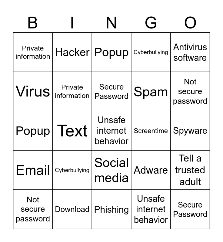 This bingo card has 25 words: Cyberbullying, Phishing, Secure Password, Not secure password, Antivirus software, Private information, Virus, Hacker, Screentime, Social media, Spam, Popup, Adware, Tell a trusted adult, Private information, Secure Password, Spyware, Popup, Not secure password, Text, Unsafe internet behavior, Download, Email, Cyberbullying and Unsafe internet behavior.
