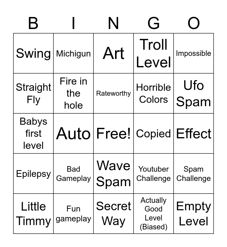 This bingo card has a free space and 24 words: Bad Gameplay, Fun gameplay, Rateworthy, Little Timmy, Impossible, Swing, Straight Fly, Michigun, Copied, Wave Spam, Horrible Colors, Babys first level, Youtuber Challenge, Spam Challenge, Fire in the hole, Actually Good Level (Biased), Effect, Art, Ufo Spam, Auto, Empty Level, Epilepsy, Troll Level and Secret Way.