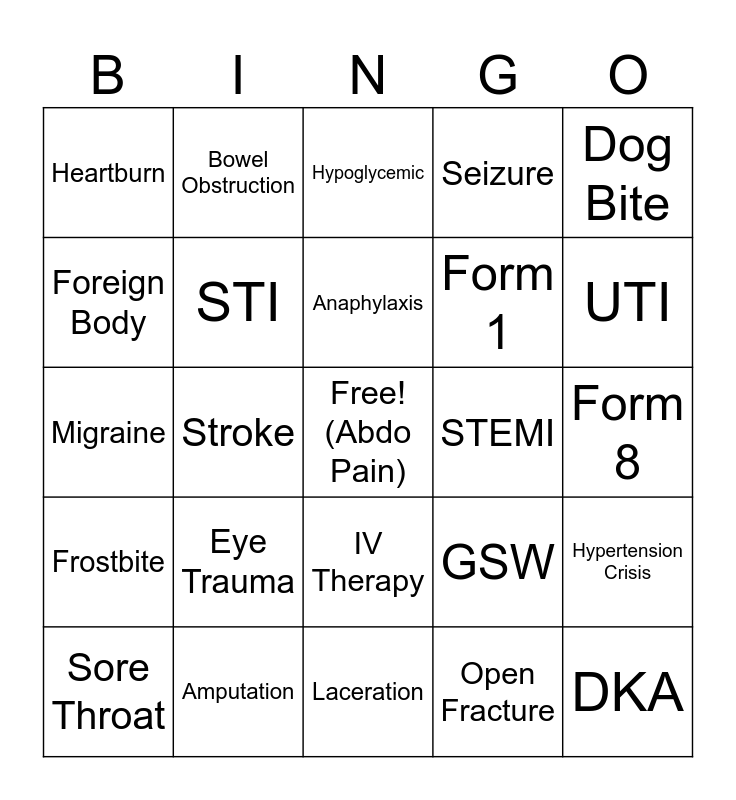 This bingo card has a free space and 55 words: Dental Pain, Sore Throat, Cough, Heartburn, Laceration, Blood Transfusion, STI, Form 10, Form 1, NSTEMI, Seizure, Preterm Labour, Withdrawal, AMA, Stabbing, Intoxication, Dog Bite, Stroke, Incarceritis, DKA, STEMI, Dislocation, GSW, Hypoglycemic, MVC, Anaphylaxis, Open Fracture, Chest Pain, Form 8, Hypertension Crisis, FTT, Seclusion, Overdose, Code Blue, Foreign Body, Migraine, Burn, Frostbite, Chicken pox / Shingles, Bugs, Bowel Obstruction, GI Bleed, Cannabinoid syndrome, Ear Ache, Eye Trauma, Amputation, Facial Trauma, Vertigo, Hallucinations, UTI, Altered LOC, Prescription refill, Cellulitis, IV Therapy and Post-op Complications.
