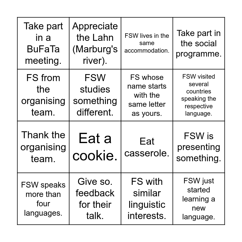 This bingo card has 36 words: FSW speaks a different language than you., Ask a question at a talk., FSW lives atleast 100km away from you., FS whose name starts with the same letter as yours., FSW learns a language for more than five years., FSW just started learning a new language., FSW visited several countries speaking the respective language., FSW learns a language as long as you have., FS from the organising team., FSW speaks the same language as you (not English / German), FSW is presenting something., Take part in the social programme., Listen to a keynote., Give so. feedback for their talk., Eat a cookie., Take part in a BuFaTa meeting., Drink coffee or tea., FSW you didn't know before., FSW speaks more than four languages., FSW lives in the same accommodation., FS with similar linguistic interests., FSW studies at the bachelor/undergraduate level., FSW studies at the master/postgraduate level., FSW is not from Germany., Wander through Marburg., Appreciate the Lahn (Marburg's river)., Eat casserole., Spot the shining Marburg heart (Spiegelslustturm)., Thank the organising team., FSW studies something different., FSW who focuses on a different language family., FSW is interested in phonetics/phonology., FSW is interested in morphology., FSW is interested in syntax., FSW is interested in semantics. and FSW is interested in pragmatics..
