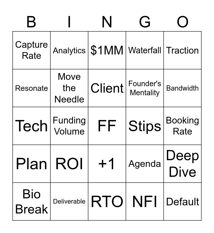 This bingo card has a free space and 24 words: ROI, Deliverable, Client, Bio Break, Traction, Capture Rate, Resonate, Analytics, Stips, +1, Founder's Mentality, Tech, Agenda, Deep Dive, Move the Needle, NFI, Booking Rate, $1MM, Bandwidth, Funding Volume, Default, Plan, Waterfall and RTO.