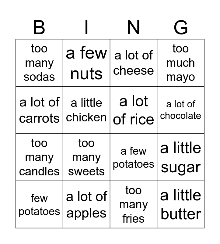 This bingo card has 16 words: a lot of apples, a little sugar, a lot of cheese, too many sodas, too many candles, a few nuts, a few potatoes, too many fries, a lot of carrots, a little chicken, few potatoes, too much mayo, too many sweets, a lot of chocolate, a lot of rice and a little butter.
