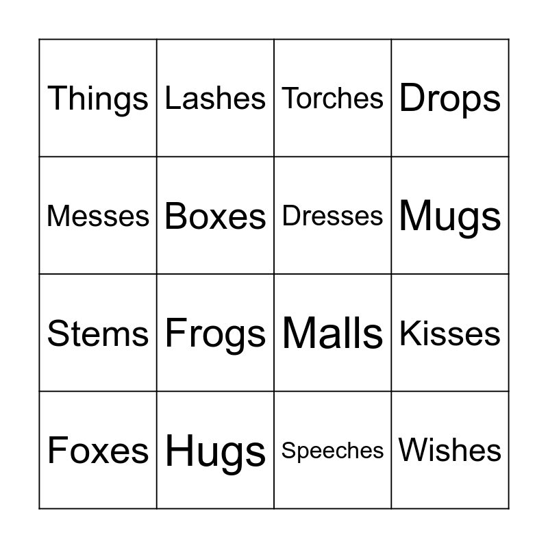 This bingo card has 16 words: Hugs, Kisses, Torches, Things, Stems, Lashes, Malls, Speeches, Messes, Boxes, Foxes, Drops, Frogs, Mugs, Dresses and Wishes.
