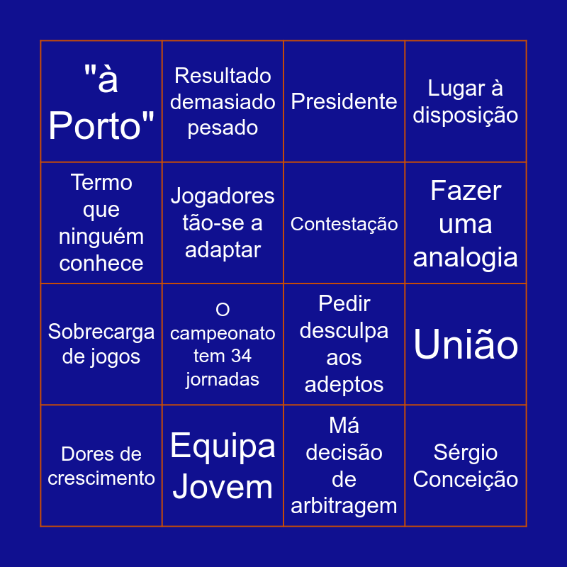 This bingo card has 16 words: Dores de crescimento, Equipa Jovem, Presidente, Lugar à disposição, Termo que ninguém conhece, Resultado demasiado pesado, Pedir desculpa aos adeptos, União, "à Porto", Jogadores tão-se a adaptar, Má decisão de arbitragem, Fazer uma analogia, Sobrecarga de jogos, O campeonato tem 34 jornadas, Contestação and Sérgio Conceição.