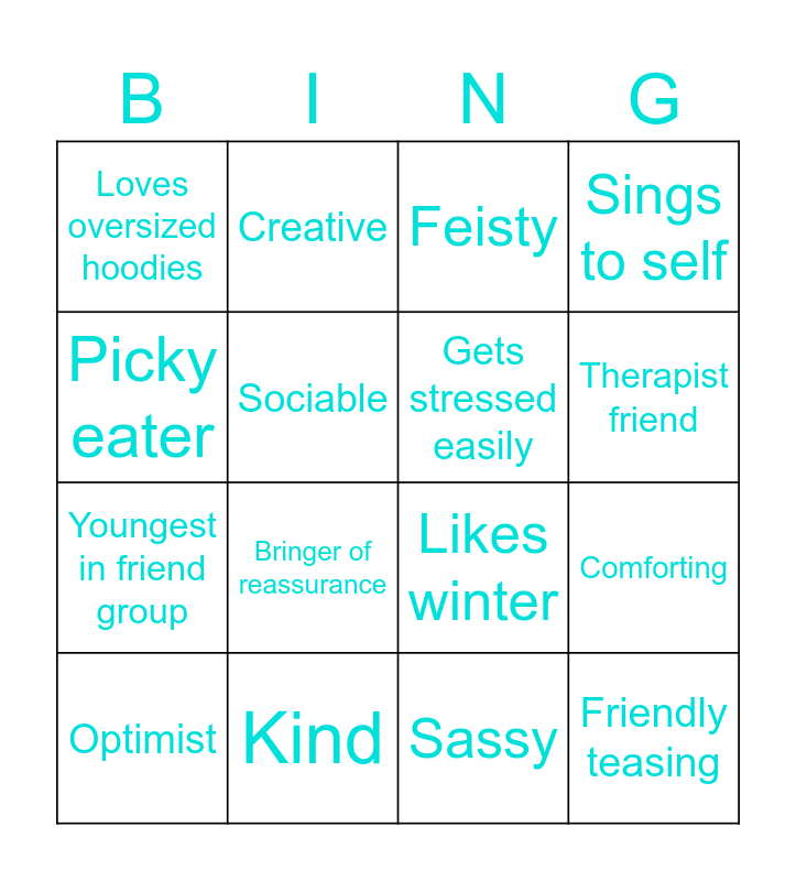 This bingo card has 16 words: Kind, Comforting, Feisty, Loves oversized hoodies, Youngest in friend group, Creative, Likes winter, Sassy, Picky eater, Sociable, Optimist, Sings to self, Bringer of reassurance, Therapist friend, Gets stressed easily and Friendly teasing.