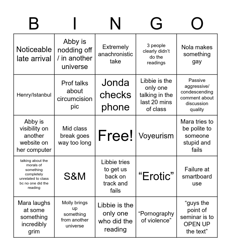 This bingo card has a free space and 24 words: S&M, Molly brings up something from another universe, Jonda checks phone, Mara laughs at some something incredibly grim, Nola makes something gay, Noticeable late arrival, Henry/Istanbul, Abby is nodding off / in another universe, Voyeurism, Libbie tries to get us back on track and fails, Libbie is the only one talking in the last 20 mins of class, Abby is visibility on another website on her computer, “Erotic”, Failure at smartboard use, Prof talks about circumcision pic, “Pornography of violence”, Mara tries to be polite to someone stupid and fails, Extremely anachronistic take, Passive aggressive/ condescending comment about discussion quality, Mid class break goes way too long, “guys the point of seminar is to OPEN UP the text”, talking about the morals of something completely unrelated to class bc no one did the reading, 3 people clearly didn’t do the readings and Libbie is the only one who did the reading.