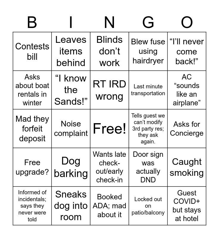 This bingo card has a free space and 24 words: Dog barking, Sneaks dog into room, RT IRD wrong, Informed of incidentals; says they never were told, “I’ll never come back!”, Contests bill, Asks about boat rentals in winter, Leaves items behind, Tells guest we can’t modify 3rd party res; they ask again., Wants late check-out/early check-in, Last minute transportation, Mad they forfeit deposit, Door sign was actually DND, Caught smoking, “I know the Sands!”, Locked out on patio/balcony, Asks for Concierge, Blinds don’t work, AC “sounds like an airplane”, Noise complaint, Guest COVID+ but stays at hotel, Free upgrade?, Blew fuse using hairdryer and Booked ADA; mad about it.