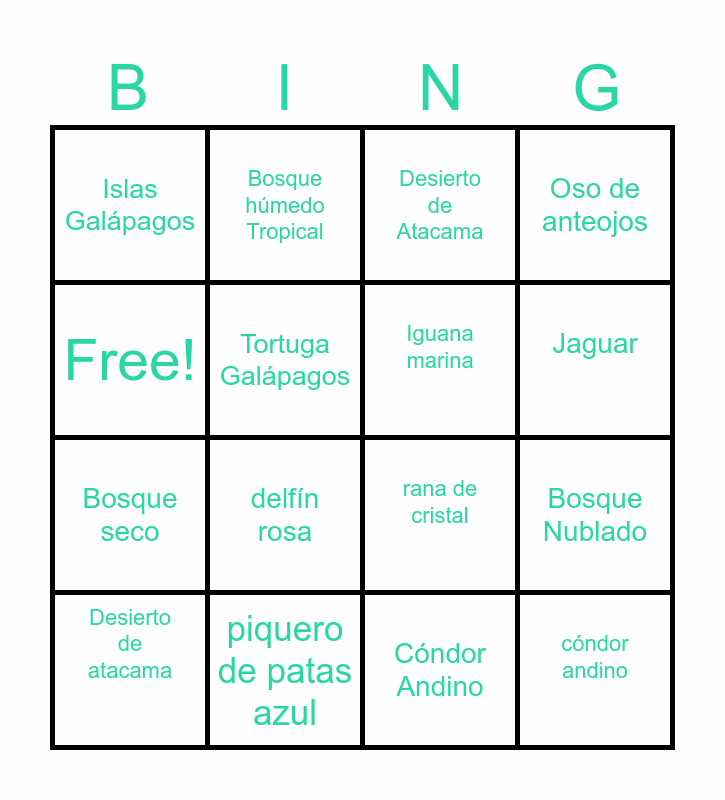This bingo card has 16 words: piquero de patas azul, Bosque Nublado, Desierto de Atacama, Islas Galápagos, Bosque seco, Bosque húmedo Tropical, rana de cristal, Cóndor Andino, Free!, Tortuga Galápagos, Desierto de atacama, Oso de anteojos, delfín rosa, Jaguar, Iguana marina and cóndor andino.