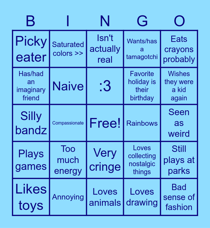 This bingo card has a free space and 24 words: Too much energy, Annoying, :3, Likes toys, Eats crayons probably, Picky eater, Has/had an imaginary friend, Saturated colors >>, Rainbows, Very cringe, Favorite holiday is their birthday, Silly bandz, Loves collecting nostalgic things, Still plays at parks, Naive, Loves drawing, Seen as weird, Isn't actually real, Wishes they were a kid again, Compassionate, Bad sense of fashion, Plays games, Wants/has a tamagotchi and Loves animals.