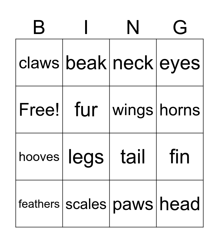 This bingo card has 16 words: scales, fin, neck, claws, hooves, beak, tail, paws, Free!, fur, feathers, eyes, legs, horns, wings and head.