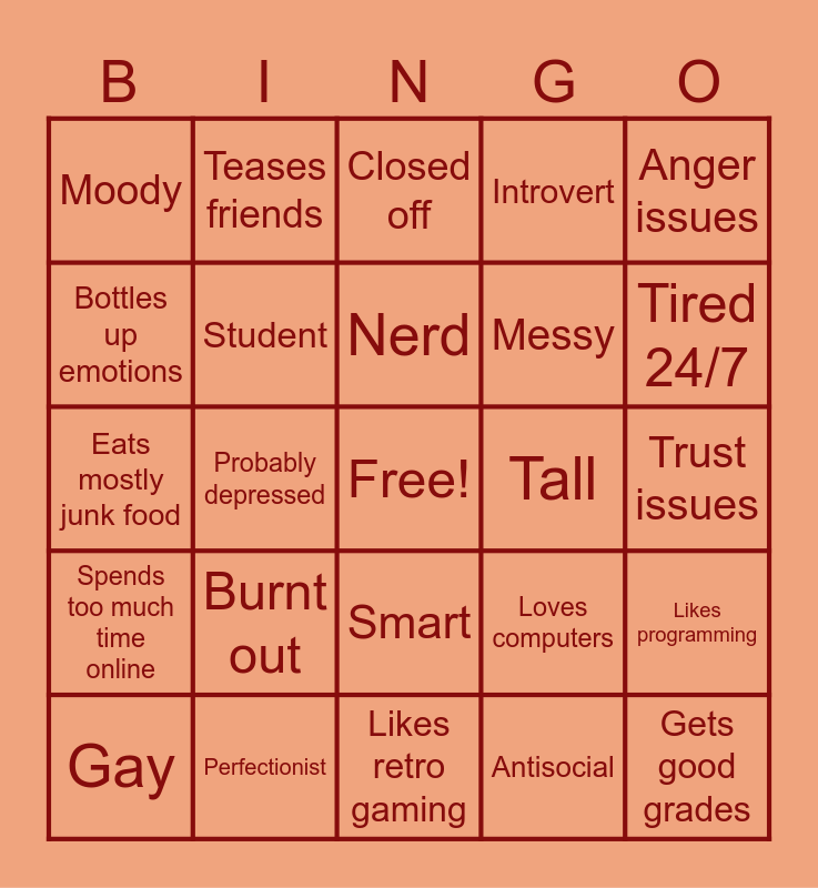 This bingo card has a free space and 24 words: Burnt out, Perfectionist, Nerd, Gay, Anger issues, Moody, Bottles up emotions, Teases friends, Tall, Smart, Messy, Eats mostly junk food, Loves computers, Likes programming, Student, Antisocial, Trust issues, Closed off, Tired 24/7, Probably depressed, Gets good grades, Spends too much time online, Introvert and Likes retro gaming.