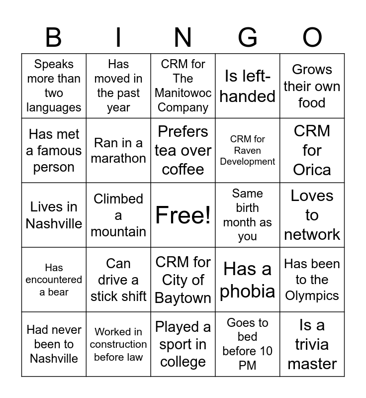 This bingo card has a free space and 50 words: Has a child under the age of 5, Is a trivia master, Can play the guitar, Played a sport in college, Can drive a stick shift, Has lived in more than one country, Has moved in the past year, Worked at a family business, Has met a famous person, Caught a fish this year, Ran in a marathon, Is left-handed, Has been to the Olympics, Has a phobia, Has a tattoo, Makes New Years Resolutions, Prefers tea over coffee, Same birth month as you, Same middle initial as you, Grows their own food, Climbed a mountain, Goes to bed before 10 PM, Speaks more than two languages, CRM for Raven Development, CRM for Amazon, CRM for Verizon Communications, CRM for Orica, CRM for Coca-Cola Bottling, CRM for The Manitowoc Company, CRM for City of Baytown, CRM for Union Pacific Railroad, CRM for Enterprise Bank, CRM for At Home, Worked in-house, Worked in construction before law, Worked in real estate before law, Has worked at HB for 20+ years, Joined HB in the past year, Previously worked in a different SBU, Loves to network, Has a tip for “working the room”, Has a degree in a field unrelated to law, Has visited 5 or more HB offices, Played in the NFL, Had never been to Nashville, Lives in Nashville, Enjoys country music, Has a dog, Has encountered a bear and Likes to kayak.