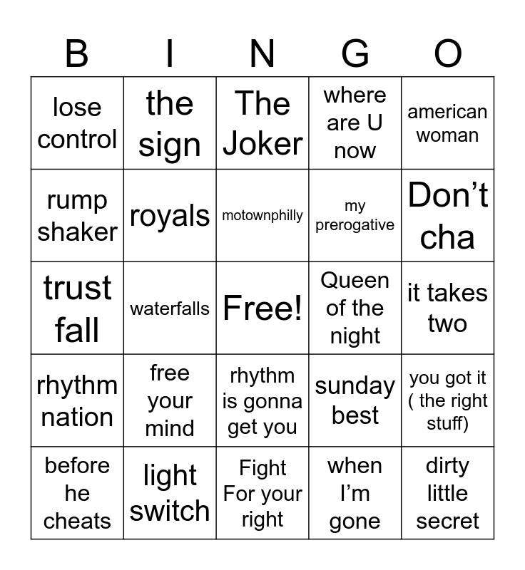 This bingo card has a free space and 65 words: my lovin, We’ve Got it goin on, step by step, you got it ( the right stuff), tonight, in the summertime, the sign, Turin up my heart, motownphilly, blue suede shoes, rhythm is gonna get you, pump up the jam, it takes two, american woman, freedom1 90, rump shaker, waterfalls, lose control, jenny from the block, my prerogative, free your mind, rhythm nation, where are U now, Africa, P.y.T, look what you made me do, Sit still look pretty, say my name, dirty little secret, titanium, before he cheats, only human, yummy, bad guy, sunday best, light switch, that’s my girl, trust fall, when I’m gone, Cover me in sunshine, royals, How will i know, Queen of the night, Walking on broken glass, believe, Whatta man, Don’t cha, Two Princes, brass monkey, Handclap, You should be dancing, All the small things, Baby i love the way, Fight For your right, Boombastic, Gimme Shelter, Come together, The Joker, Satisfaction, Victoria Secret, Die With a Smile, I had some help, apple, Push It and Lovesick blues.