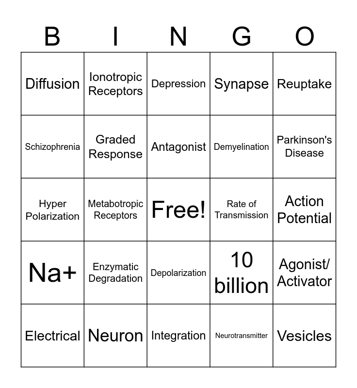 This bingo card has a free space and 24 words: Enzymatic Degradation, Neuron, Antagonist, Electrical, Reuptake, Diffusion, Schizophrenia, Ionotropic Receptors, Rate of Transmission, Depolarization, Demyelination, Hyper Polarization, 10 billion, Agonist/ Activator, Graded Response, Neurotransmitter, Action Potential, Depression, Parkinson's Disease, Metabotropic Receptors, Vesicles, Na+, Synapse and Integration.