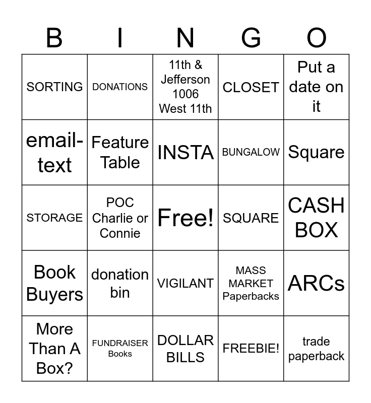 This bingo card has a free space and 29 words: More Than A Box?, MEDIA CDs- DVDs, POC Charlie or Connie, ART4ART, SORTING, 11th & Jefferson 1006 West 11th, Feature Table, donation bin, SQUARE, FUNDRAISER Books, CASH BOX, trade paperback, DOLLAR BILLS, FREEBIE!, Square, DISCARDS, VIGILANT, Book Buyers, Put a date on it, STORAGE, MASS MARKET Paperbacks, 2 for $1, BUNGALOW, email-text, CLOSET, DONATIONS, ARCs, INSTA and SALES.