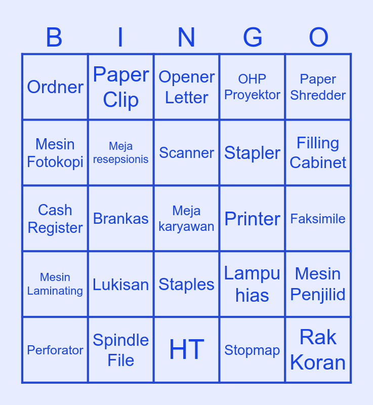 This bingo card has 25 words: Lukisan, HT, Scanner, Perforator, Paper Shredder, Ordner, Mesin Fotokopi, Paper Clip, Printer, Staples, Stapler, Cash Register, Lampu hias, Mesin Penjilid, Meja resepsionis, Rak Koran, Faksimile, Opener Letter, Filling Cabinet, Brankas, Meja karyawan, Spindle File, Mesin Laminating, OHP Proyektor and Stopmap.