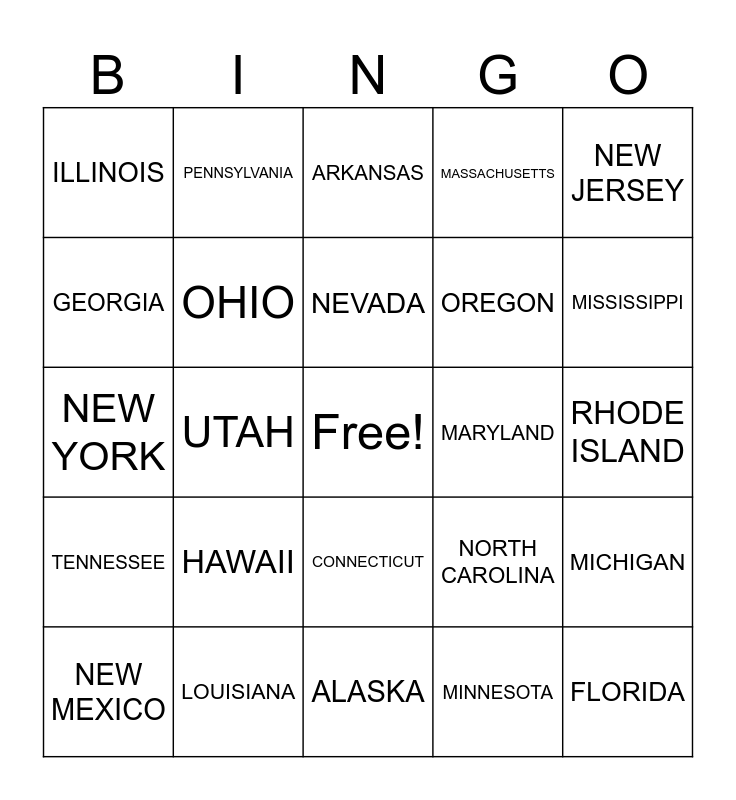 This bingo card has a free space and 49 words: CALIFORNIA, FLORIDA, TEXAS, ALASKA, HAWAII, VIRGINIA, PENNSYLVANIA, ARIZONA, GEORGIA, INDIANA, OHIO, MASSACHUSETTS, MICHIGAN, NORTH CAROLINA, WASHINGTON, COLORADO, NEVADA, MARYLAND, ALABAMA, NEW JERSEY, UTAH, MINNESOTA, ILLINOIS, OREGON, MONTANA, MISSISSIPPI, NEW MEXICO, WISCONSIN, CONNECTICUT, TENNESSEE, MAINE, WYOMING, IDAHO, MISSOURI, LOUISIANA, KENTUCKY, IOWA, KANSAS, RHODE ISLAND, NEW HAMPSHIRE, OKLAHOMA, SOUTH CAROLINA, DELAWARE, VERMONT, NEW YORK, ARKANSAS, WEST VIRGINIA, SOUTH DAKOTA and NORTH DAKOTA.
