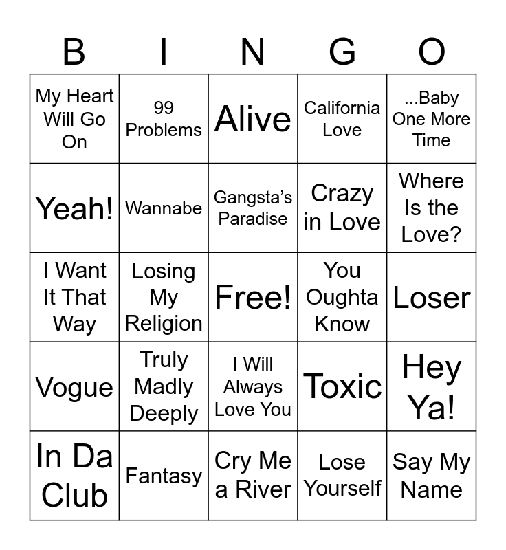 This bingo card has a free space and 40 words: Smells Like Teen Spirit, I Want It That Way, No Scrubs, Wannabe, Fantasy, I Will Always Love You, Gangsta’s Paradise, Nuthin’ but a G Thang, ...Baby One More Time, Vogue, Losing My Religion, California Love, Say My Name, Loser, You Oughta Know, Truly Madly Deeply, Juicy, My Heart Will Go On, Under the Bridge, Alive, Hey Ya!, Lose Yourself, Crazy in Love, Yeah!, Clocks, Fallin’, Hot in Herre, Boulevard of Broken Dreams, In the End, Hips Don’t Lie, Umbrella, In Da Club, Since U Been Gone, Toxic, Where Is the Love?, Cry Me a River, Poker Face, Stronger, 99 Problems and Get Ur Freak On.