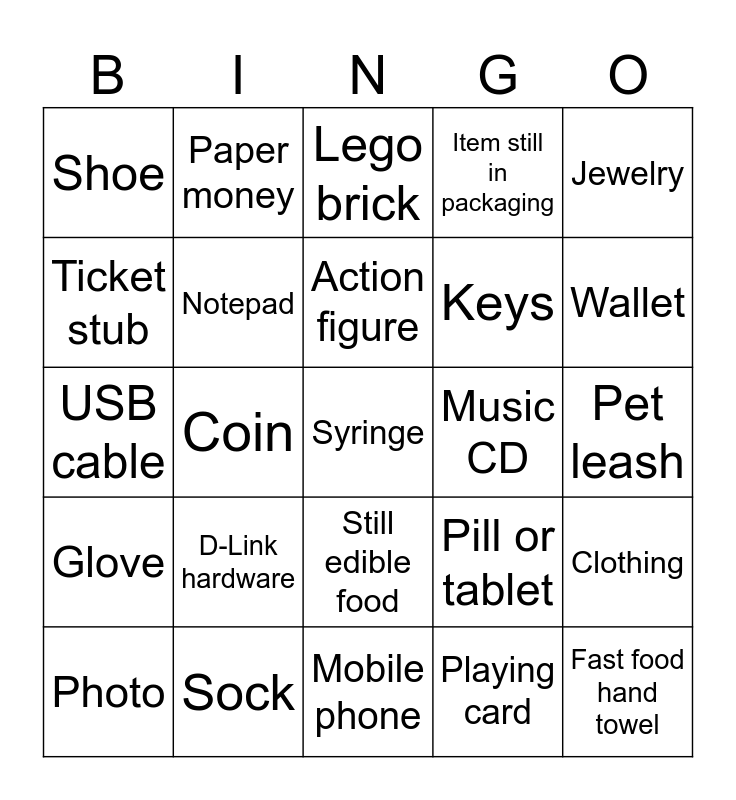 This bingo card has a free space and 24 words: D-Link hardware, Sock, Action figure, Photo, Jewelry, Shoe, Ticket stub, Paper money, Music CD, Still edible food, Keys, USB cable, Pill or tablet, Clothing, Notepad, Playing card, Pet leash, Lego brick, Wallet, Coin, Fast food hand towel, Glove, Item still in packaging and Mobile phone.