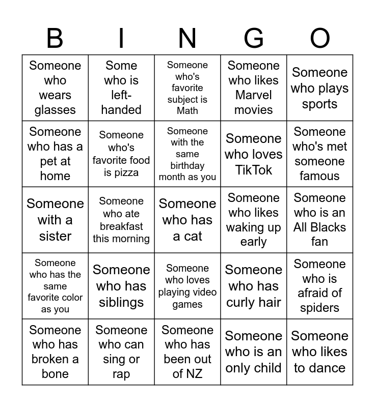 This bingo card has 25 words: Someone who has siblings, Someone who has been out of NZ, Someone with the same birthday month as you, Someone who has broken a bone, Someone who plays sports, Someone who wears glasses, Someone who has a pet at home, Some who is left-handed, Someone who likes waking up early, Someone who loves playing video games, Someone who loves TikTok, Someone with a sister, Someone who has curly hair, Someone who is afraid of spiders, Someone who's favorite food is pizza, Someone who likes to dance, Someone who is an All Blacks fan, Someone who's favorite subject is Math, Someone who's met someone famous, Someone who ate breakfast this morning, Someone who has a cat, Someone who can sing or rap, Someone who has the same favorite color as you, Someone who likes Marvel movies and Someone who is an only child.