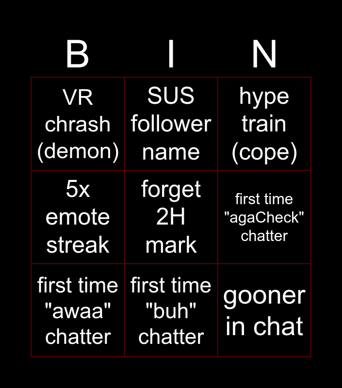 This bingo card has a free space and 8 words: first time "agaCheck" chatter, hype train (cope), SUS follower name, first time "awaa" chatter, VR chrash (demon), gooner in chat, 5x emote streak and first time "buh" chatter.