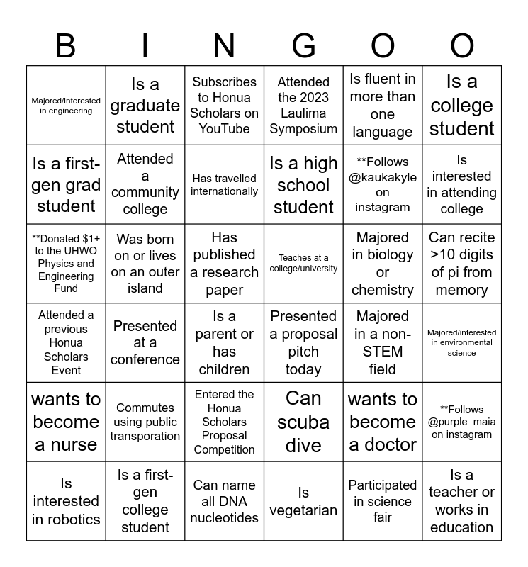 This bingo card has 47 words: **Donated $1+ to Honua Scholars, **Donated $1+ to the UHWO Physics and Engineering Fund, **Follows @honuascholars on Instagram, Majored in a non-STEM field, Majored in biology or chemistry, Can scuba dive, Is a graduate student, Is a middle school student, Is a college student, Is a first-gen college student, Is a first-gen grad student, Attended the 2023 Laulima Symposium, Presented at a conference, Attended a previous Honua Scholars Event, Participated in science fair, Entered the Honua Scholars Proposal Competition, Attended a community college, Was born on or lives on an outer island, Is a middle or high school teacher, Is fluent in more than one language, Is interested in attending college, Majored/interested in environmental science, Majored/interested in engineering, Has travelled internationally, Works or volunteers for a non-profit, Is a high school student, Is a parent or has children, Can program in python, swift, or arduino, Can recite >10 digits of pi from memory, Teaches at a college/university, Has a PhD or MD, Commutes using public transporation, Is vegetarian, Is a teacher or works in education, Can name all DNA nucleotides, Presented a proposal pitch today, Has published a research paper, Is interested in robotics, Has a Holo card with them, wants to become a doctor, wants to become a nurse, Subscribes to Honua Scholars on YouTube, **Follows @kaukakyle on instagram, **Follows @kumulelemia on instagram, **Follows @pacehawaii on instagram, **Follows @purple_maia on instagram and **Follows @hawaiipeoplesfund on instagram.